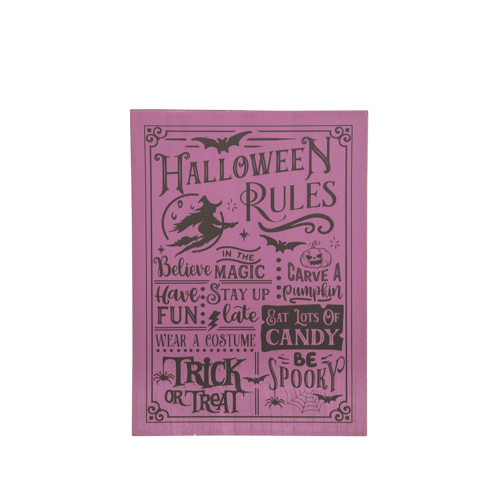 Bring Halloween spirit to your home with this playful purple wooden sign! Featuring festive rules for celebrating the spookiest of holidays, it's sure to add a bit of supernatural fun!