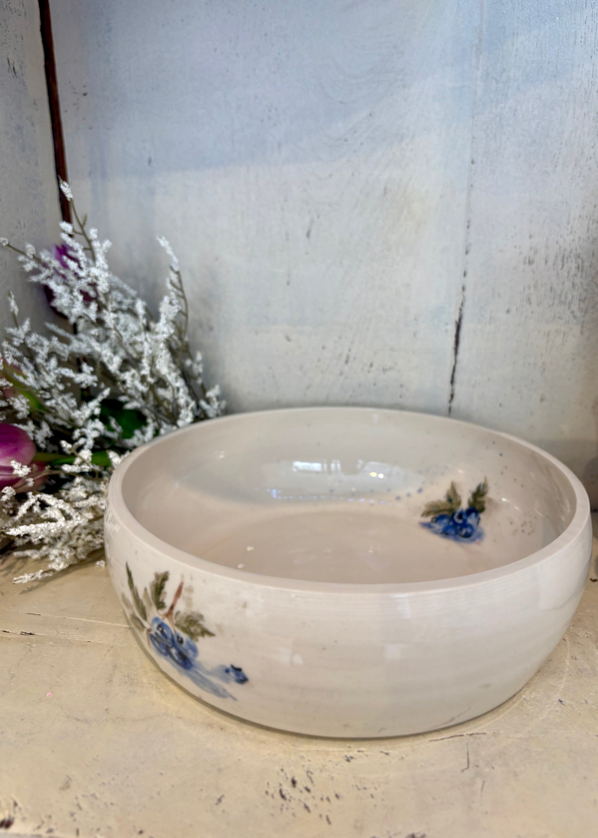 With soft curves and a timeless profile, the Blueberry Meadow Mixing Bowl brings artistic charm to everyday cooking and serving. Hand-thrown and finished in a clear glaze that reveals the warmth of the clay beneath, this generously sized bowl features delicate blueberry branches on both its interior and exterior—each brushstroke capturing the feel of a quiet garden morning.