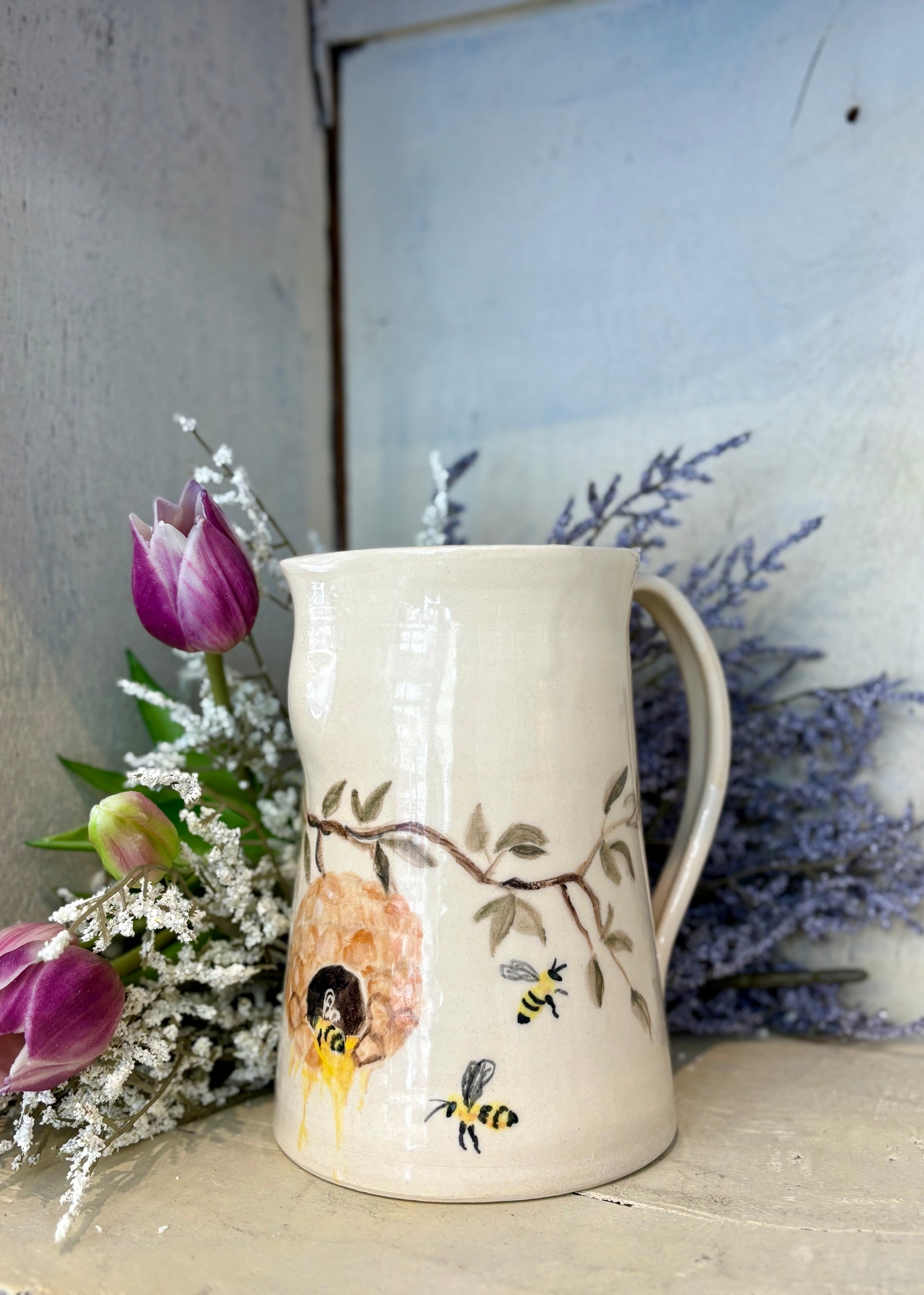 This handmade pitcher can be used for summer punches and parties, or used as a beautiful vase for florals! It's adorned with a hand-painted beehive dripping with honey surrounded by buzzing bees