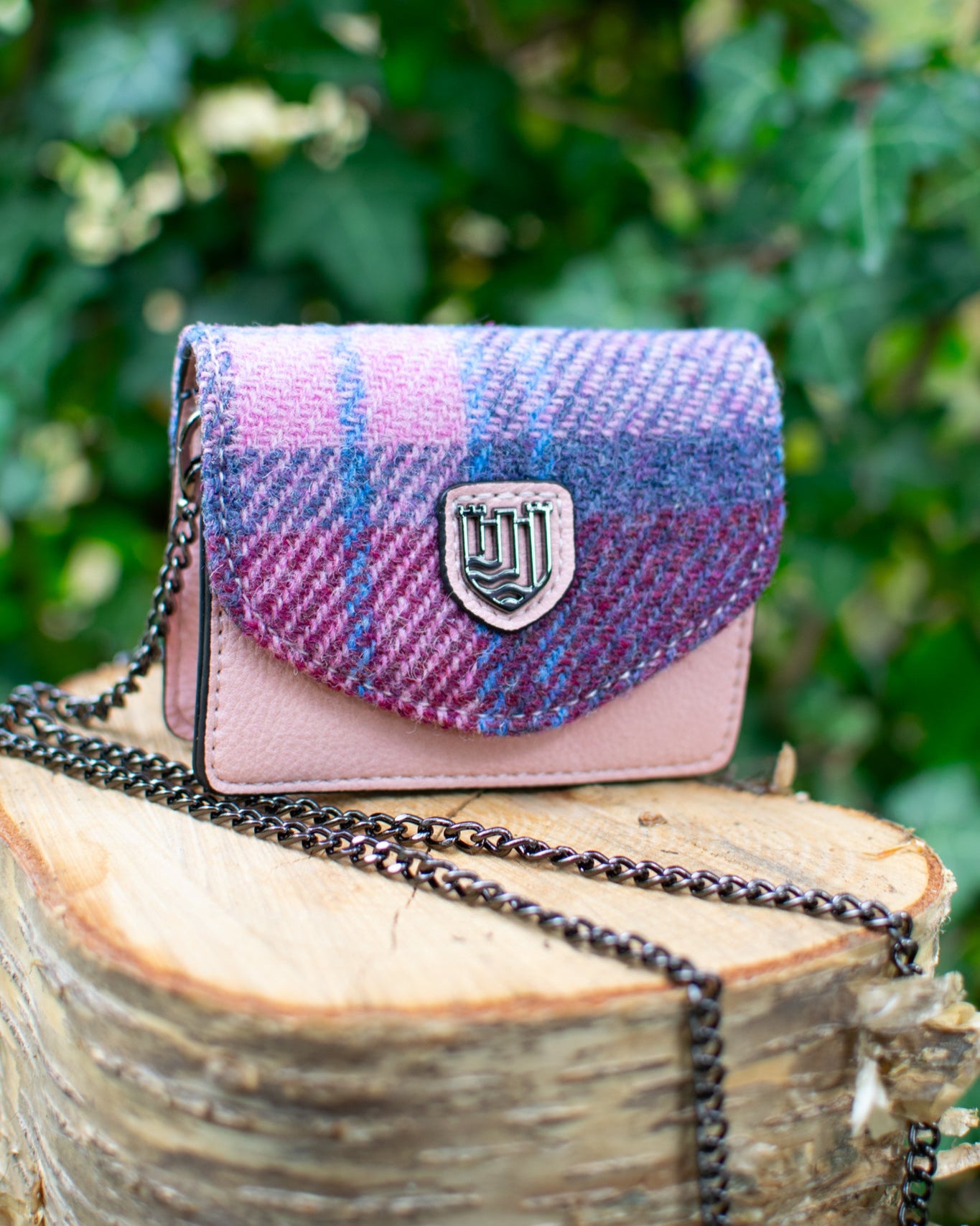 Herringbone patterned wallet on a wooden stump with green foliage in the background